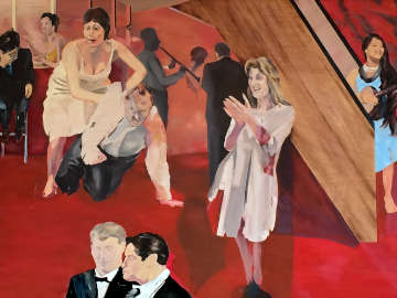 The sausage: 8'x4' painted with acrylic and oil paints on sanded and varnished plywood. Technology: Surfing Experience and Ability Transferometer Vigor Reverser.